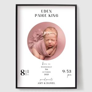 Celebrate life’s most precious moment with our personalised birth and birthday posters — beautiful custom prints designed to capture the details of your child’s arrival. In this collection, you can create a unique poster by adding your baby’s name, date of birth, time, weight and length, turning special memories into timeless wall art.