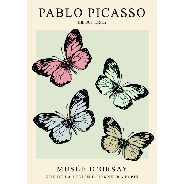 This stunning poster features 'The Butterfly' by Pablo Picasso, showcasing vibrant butterflies in an elegant composition. Displayed at the Musée d'Orsay, Paris, this artwork captures the beauty and elegance of Picasso's style. 'PABLO PICASSO', 'THE BUTTERFLY', 'MUSÉE D'ORSAY', 'RUE DE LA LÉGION D'HONNEUR - PARIS'. Product contains a single poster only.