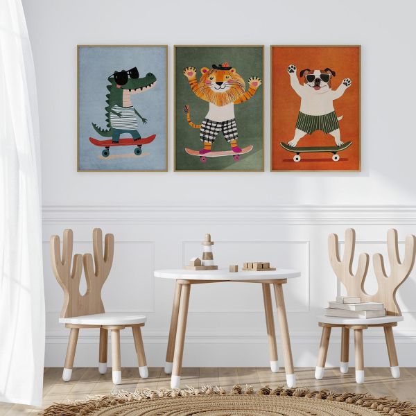 This vibrant set of posters showcases playful animals on skateboards, perfect for adding a touch of fun to any room. Featuring a crocodile, a tiger, and a dog, these posters bring charm and whimsy to your decor. Product contains a set of 3 posters only.